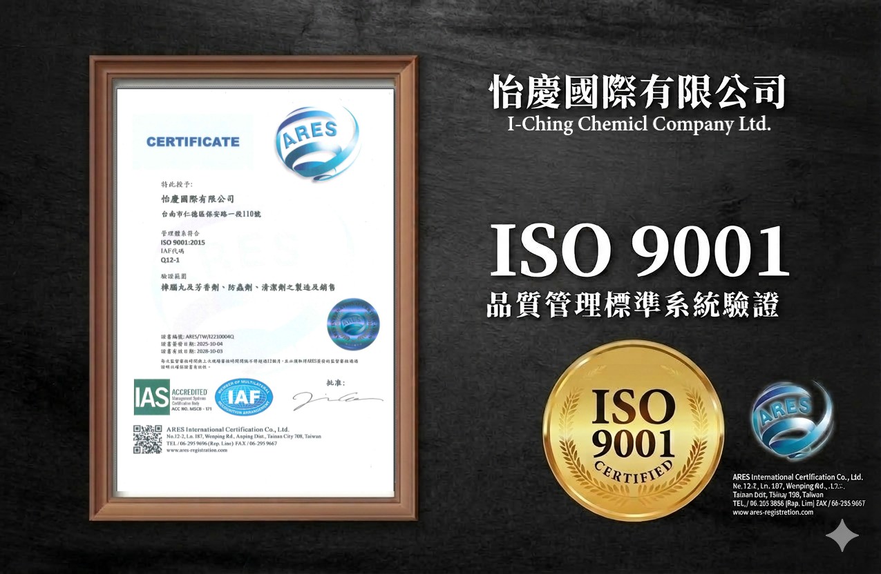 怡慶國際有限公司位於台灣台南市, 具備ISO 9001認證的專業工廠, 製造防蟲錠、清潔劑及香氛產品, 提供居家防蟲、清潔、除臭 不同的解決方法, 營造優質的生活環境。50年以上的經驗, 優良的品質、合理的價格與專業的服務, 受到消費者的信賴與支持。