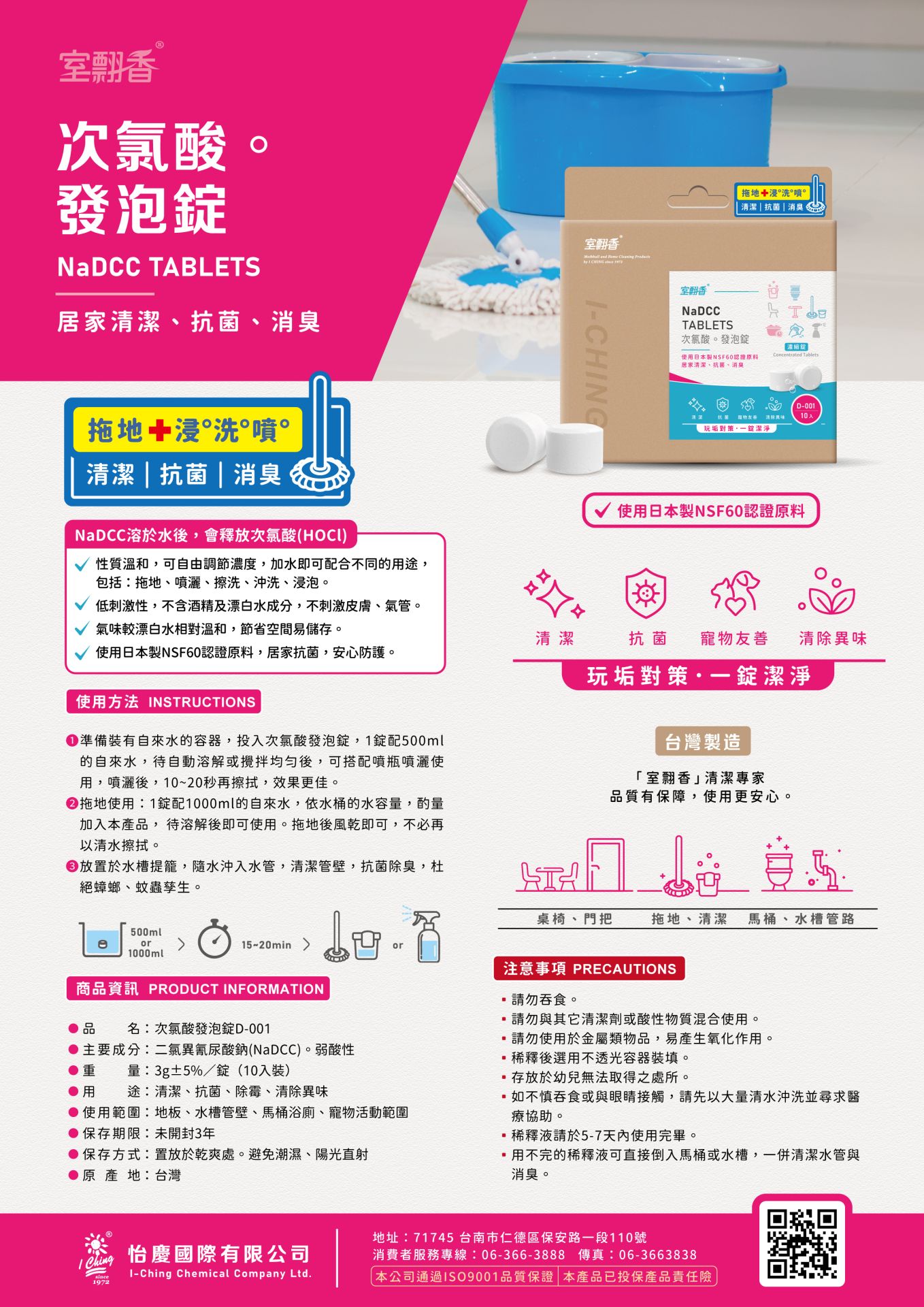 高效環保, 一錠多用途, 居家清潔、抗菌、消臭。 NaDCC溶於水後,會釋放次氯酸(HOCl)。 ☉ 性質溫和, 可自由調節濃度,加水即可配合不同的用途, 包括: 拖地、噴灑、擦洗、沖洗、浸泡。 ☉ 低刺激性, 不含酒精及漂白水成分, 不刺激皮膚、氣管。 ⊙氣味較漂白水相對溫和 ☉ 節省空間易儲存。 ☉ 可生物降解, 友善寵物。
